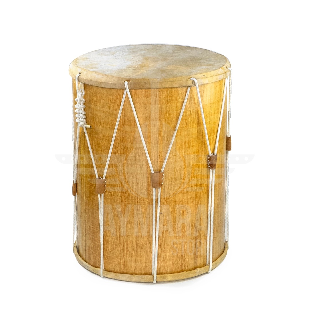 ![]() Le bombo andin, très utilisé pour accompagner les flûtes de pan, les Tarkas ou encore le folkore sud-américain, est un gros tambour cylindrique en bois, revêtu à chaque extrémité d’une peau (en général, de chèvre, poilue, tondue ou tannée selon les styles, et tendue à l’aide de cordes. Il se distingue du bombo leguero argentin, dont le fût est creusé dans une seule pièce de bois. Ce dernier, de même que le bombo criollo, présente également un cerclage proéminent en bois, que l’on peut frapper avec une baguette, contrairement au bombo andin dont on ne frappe que la peau. |